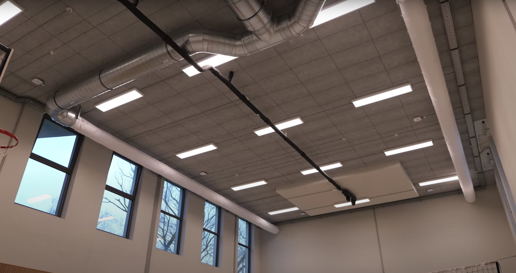 De omvang van de site, met een totale vloeroppervlakte van 26.000 m2, en de vele functies maakten het voor de architecten een uitdagend project. Bestaande niveauverschillen van het terrein worden ingezet om het programma binnen een compact geheel te organiseren. Zo wordt de ruimte boven de deels verzonken fuifzaal mee ingezet als speelplaats van de school.